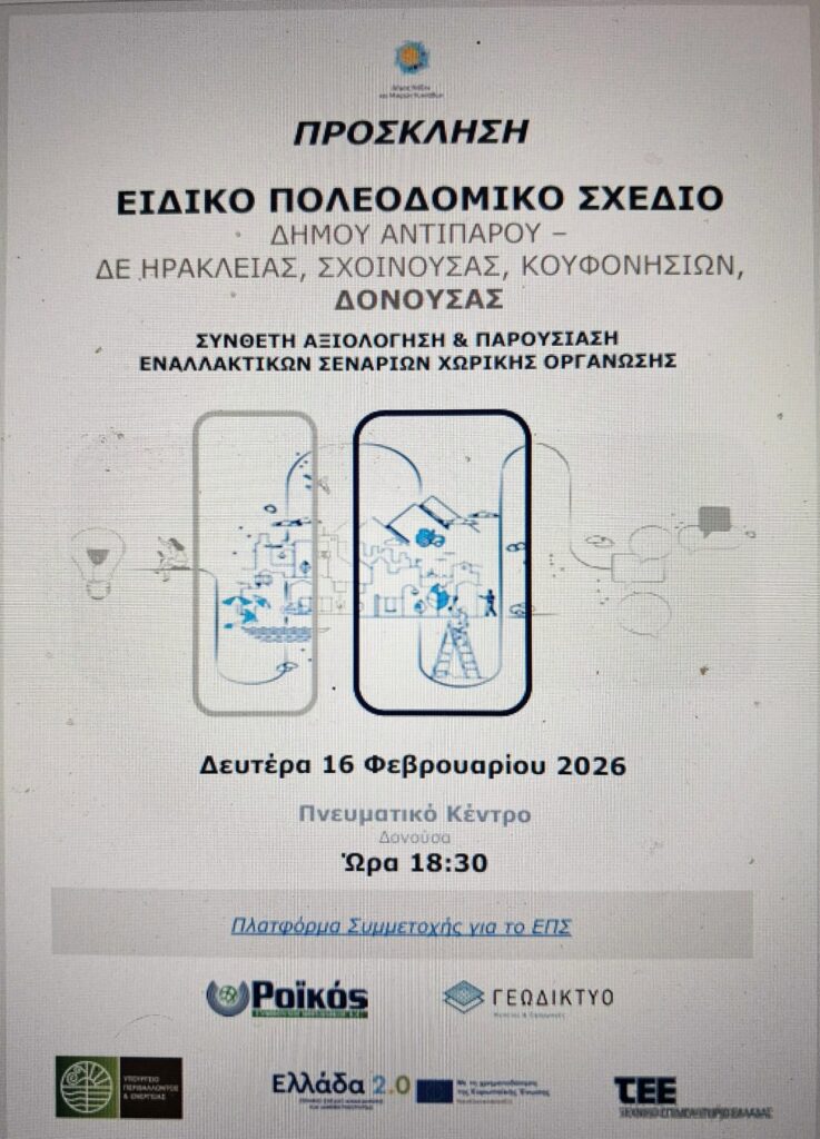 Τη Δευτέρα 16/2 στις 18.30μμ στο πνευματικό κέντρο του Σταυρού θα γίνει η παρουσίαση και δημοσιοποίηση των πορισμάτων της Ά ενότητας του Ειδικού Πολεοδομικού Σχεδίου και των προτεινόμενων εναλλακτικών σεναρίων χωρικής οργάνωσης της Δημοτικής Ενότητας Δονούσας.
